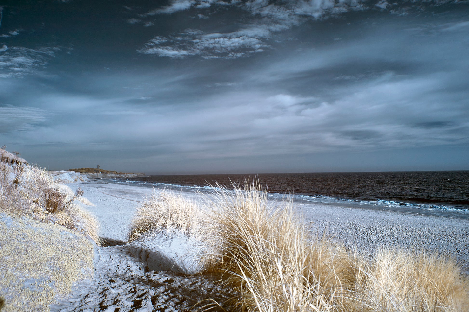 This is an infra red photograph of Happisburgh beach in Norfolk.