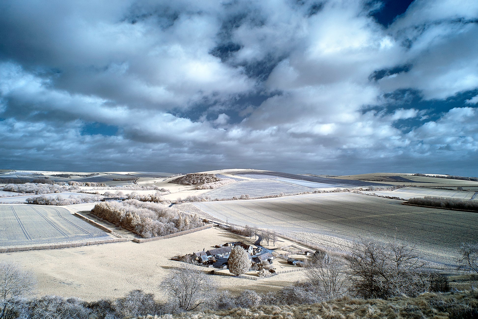 This is an infra red photograph of the view over Lower Barpham to Harrow Hill on the South Downs in West Sussex.